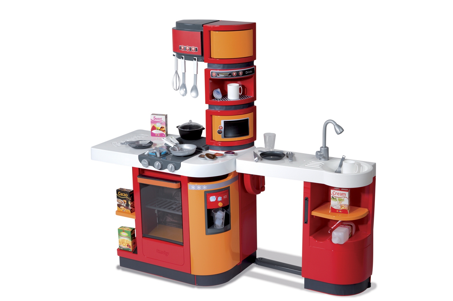 Кухню можно поставить к стене, а можно сложить одну половину и сделать доступ кухню с двух сторон. На плите 2 конфорки: электронная (звуки шипения и варения) и механическая(имитация газа конфорки). В духовом шкафу открывается дверка, внутри есть полка. В дверцу холодильника встроен дозатор для кубиков льда, при нажатии на кнопку лед падает в стакан. Дверца холодильника открывается. Присутствует имитация встроенной СВЧ и кофеварки, в которую можно вставлять сменные диски кофе. Ящичек на верху кухни открывается. Так же кухня оборудована рабочим столом и раковина с краном (без воды). В комплекте 33 аксессуара: 2 набора столовых приборов, кастрюля, сковородка, 2 кружки, 2 чашки, венчик, большая ложка, ложка для спагетти, 6 кофейных дисков, 3 кубика льда, 1 бутылочка, 4 коробочки. Высота кухни 99см. Для работы требуются батарейки: 1*CR2032