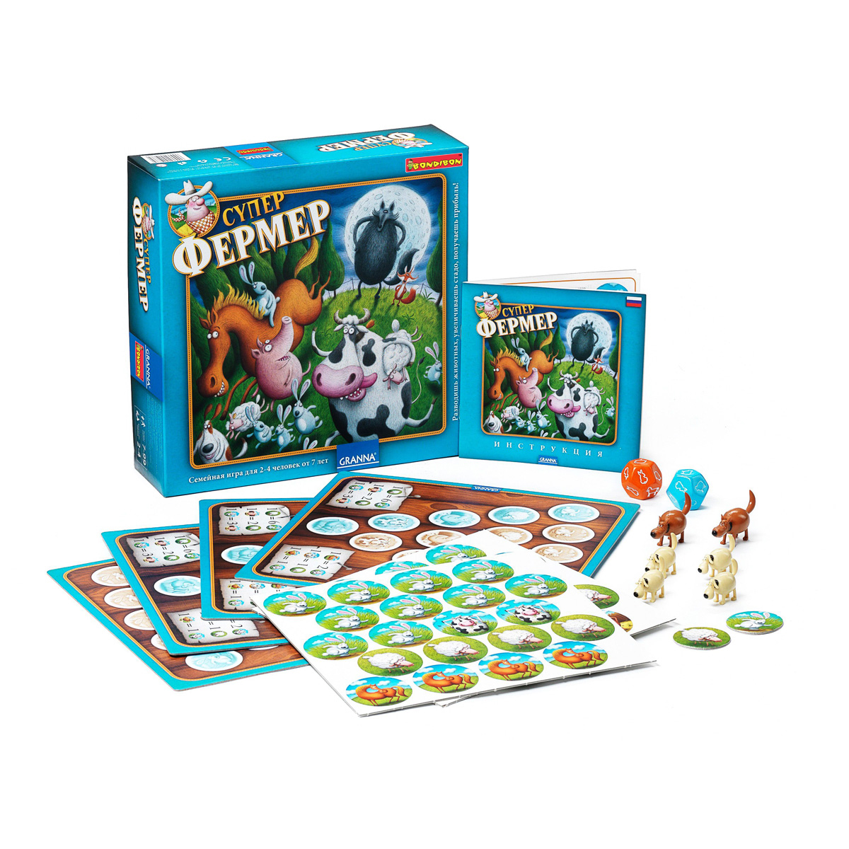 Экономическая игра для всей семьи. Играя, каждый из участников сможет попробовать себя в роли фермера, занимающегося разведением домашних животных. Начните с пары кроликов, которые так быстро размножаются. Потом вы сможете поменять их на крупных животных: коров, свиней, овец или лошадей. Сами животные сделаны в виде картонных кружков, которые удобно расставлять на игровых полях. Чтобы определить на разведении каких животных ваша ферма будет специализироваться дальше, каждый ход участник бросает кубик с картинкам. Охраняют стада опытные пастушеские собаки в виде симпатичных пластмассовых фигурок. Они очень нужны, ведь на ваших животных может напасть лиса или волк! Игра основана на интересных математических правилах. «Супер фермер» - это экономическая игра, которая научит считать, строить планы, предвидеть события, оценивать риски. Все эти навыки в жизни просто необходимы!