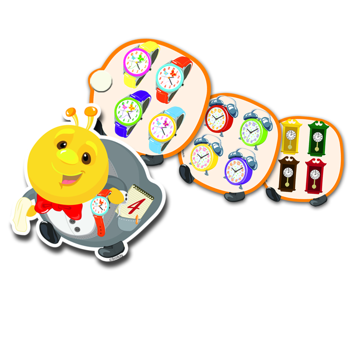 Волшебная гусеница научит малыша считать и различать цифры. На каждом брюшке гусеницы нужно расставить те или иные предметы в нужном количестве и посчитать. Например, 4 пары часиков. Кроме этого, ребенок запоминает предметы, узнает о том, что они бывают разные: часики, которые можно носить на руке или напольные часы и даже будильники."