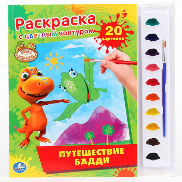 Увеличить"УМКА". РАСКРАСКА. РАСКРАСКА С ЦВЕТ. КОНТ. И КРАСКАМИ. ПОЕЗД ДИНОЗАВРОВ. ПУТЕШЕСТВИЕ БАДДИв кор.40шт