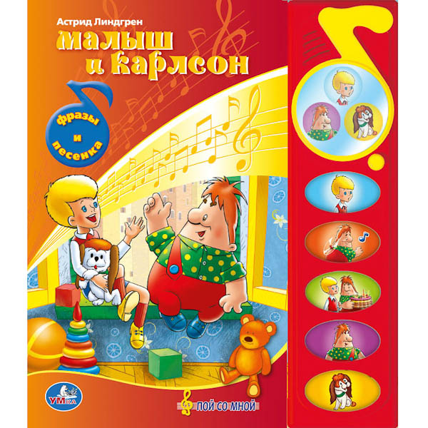 Увеличить"УМКА". МАЛЫШ И КАРЛСОН (5 ЗВУКОВЫХ КНОПОК С ЗЕРКАЛЬЦЕМ). ФОРМАТ: 195 Х 230ММ. 10 СТР. в кор.32шт