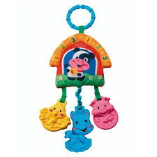 Мобиль имеет три прорезывателя - в виде желтого цыпленка, синей лошадки и розового поросенка. Посередине висит синяя лошадка с ручкой внизу, потянув за которую, малыш услышит музыку или звуковые эффекты. Сверху находится петелька, с помощью которой мама легко сможет прикрепить мини-мобиль к к детскому автомобильному креслу, коляске или манежу.