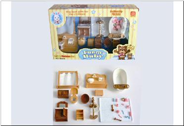 ванна, унитаз с крышкой, большая тумба с раковиной и зеркалом, маленькая тубочка, корзина для белья (или таз), перегородка с маленькой раковиной, держателями для полотенца и для туалетной бумаги. душ, стойка с занавеской, навесная полочка на ванну, табуретка, навесная полка. А также, мелкие аксессуары (зубные щетки, чашечки, мыло, тюбики и др.)