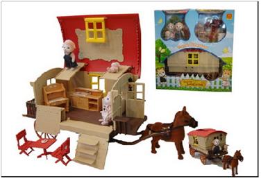 Трейлер на колесах с откидными кроватками, пони, набор мебели для кухни (буфет, тумба с раковиной, плита), стол с двумя складными стульями, сковородка, кастрюлька, ковшик, чайник, разделочная доска, три тарелочки с едой, столовые приборы. А также, семью овечек - папу, маму и малыша.