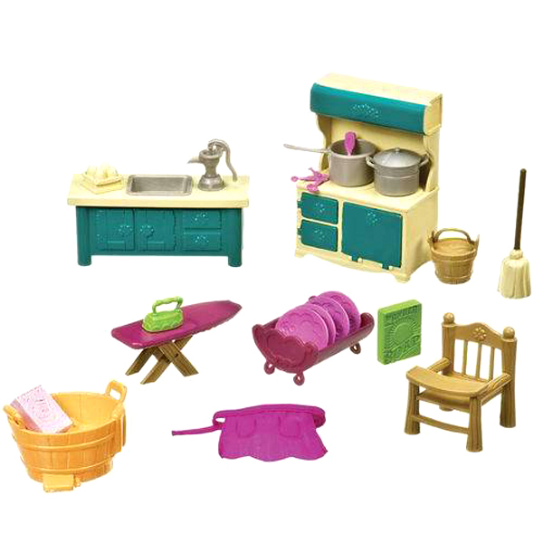 Игровой набор Лил Вудзис (Li'l Woodzeez) для кухни и уборной состоит из 21 предмета, которые сделают интересной сюжетно-ролевую игру. В наборе есть все необходимые аксессуары, чтобы сделать кухню уютной, а уборную чистой. В наборе: - разделочный стол с мойкой, краном и рабочей поверхностью, - шкаф для посуды, - стул для кормления младшего ребеночка из семьи зверушек Лил Вудзис. - сушилка для посуды, - кастрюли, - гладильная доска, - утюг, - швабра, - ведро для уборки, - таз для стирки, - фартук для хозяйки, - мыло, - стиральный порошок. Все предметы сделаны с удивительной точностью, с ними приятно играть. Возраст: 3+.
