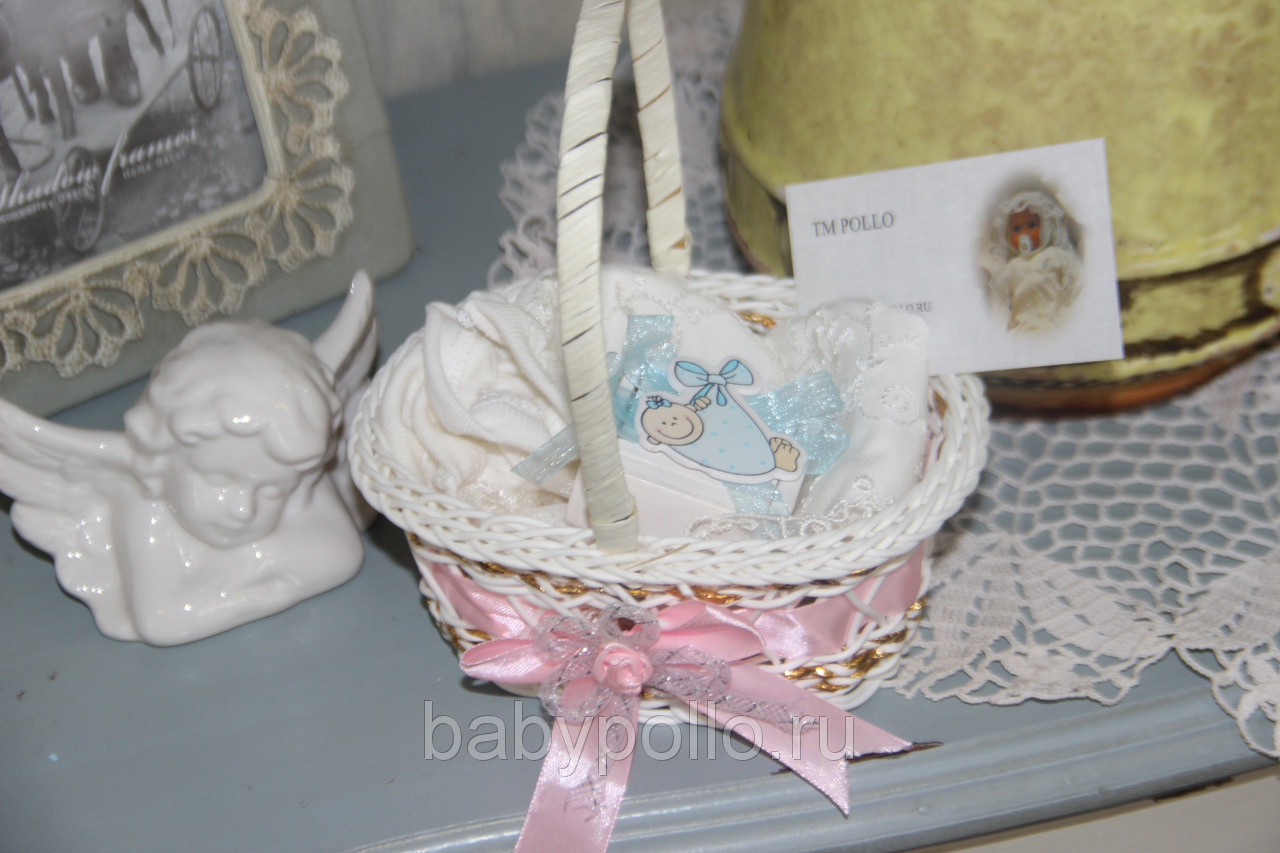 Очаровательная маленькая корзиночка с нарядным чепчиком 2-051 и царапками 2-055 , декорированные гипюром