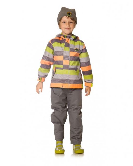 Стильный универсальный костюм, состоящий из яркой в цветную полоску куртки, темных брюк, жакета и шапочки в тон брюкам. Технологичная ткань с водоотталкивающим покрытием сохранят тепло в прохладную, сырую погоду. Трикотажная подкладка куртки и брюк подходит для любой погоды и очень комфорта в использовании. Съемный жакет из качественного микрофлиса можно использовать как пристегнутым к куртке для дополнительного утепления, так и отдельно, как самостоятельный жакет. Удобные брюки усилены в местах повышенного износа, колени и по низу брючин, износостойкой тканью Cordura, а дополнительная резинка по низу брюк сохраняет тепло и защищает от попадания влаги. Стильный образ отлично дополняет шапка из микрофлиса (в комплекте) и резиновые сапоги в яркую полоску (заказываются дополнительно). Для удобства использования шапка для мальчиков от 6 мес до 4х лет выполнена с завязками, с 5 до 10 лет - без завязок.