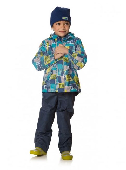 Яркий костюм, раскрашенный в синий, мятный, серый и салатовый цвета, с дизайнерским абстрактным принтом, раскрывающим тему городских строений. Технологичная ткань с водоотталкивающим покрытием и подкладка из микрофлиса (в куртке) сохранят тепло в прохладную, сырую погоду. Удобные легкие брюки с трикотажной подкладкой, усиленные в местах повышенного износа, колени и по низу брючин, износостойкой тканью Cordura, также имеют водоотталкивающий слой, а дополнительная резинка по низу брюк сохраняет тепло и защищает от попадания влаги. Стильный образ отлично дополняют синяя шапка в тон брюкам из микрофлиса (в комплекте) и яркие полосатые резиновые сапоги (заказываются дополнительно). Для удобства использования шапка для мальчиков от 6 мес до 4х лет выполнена с завязками, с 5 до 10 лет - без завязок.