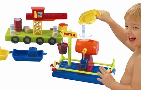 Самая настоящая строительная площадка плавает в воде вместе с малышом, составляя ему компанию во время купания в ванной, развлекая и знакомя с различными возможностями воды.