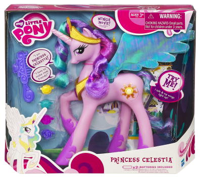 Помогите принцессе Селестии управлять своим королевством! Эта прекрасная электронная пони может многое Вам сказать. Когда Вы с принцессой готовы взлететь, нажмите кнопку, чтобы её крылья озарились светом и стали двигаться. Расчёсывайте прекрасные фиолетовые и розовые локоны своей принцессы и одевайте ей заколки, чтобы её Величество всегда выглядела ослепительно!