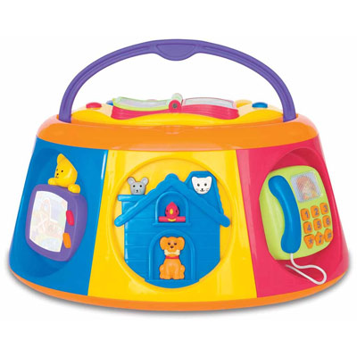 На остальных сторонах расположились: кнопочный телефон с настоящим звонком и гудком, открывающаяся входная дверь со звуком дверного звонка, телевизор с двумя цветными кнопками и светящимся экраном, домик с животными,нажав на которые малыш услышит их голоса, руль с клаксоном для маленьких водителей, мини-компьютер с кнопочками-фигурами и светящимся экраном.