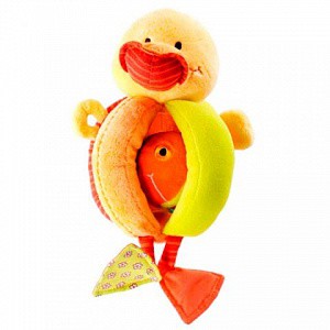 Утенок Ники - красивая яркая погремушка, которую удобно держать маленькими ручками. Погремушка имеет различные текстуры, которые развивают тактильные ощущения малыша, а также маленький секрет: рыбку на веревочке, которая может находиться как снаружи, так и внутри утенка-погремушки.