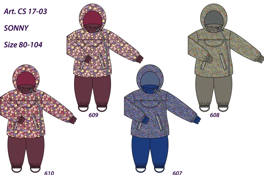 Демисезонный комплект. Ткань мембрана 5000/5000. Утеплитель Isosoft, 80 гр, подкладка полиэстр, отделка капюшона - флис. Ворот и манжеты у куртки - вязаное полотно п/ш (полушерсть). Капюшон отстегивается, по низу куртки встроенная утяжка. По бокам карманы, также нагрудный карман. Куртка имеет своеобразый крой со скошенной молнией. Размеры: 80-104.