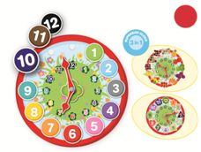 1 часы, разделенные на 4 части; 1 карточка с подвижными стрелками; 12 цифр разного цвета; 12 цифр разной формы; 12 фруктов и овощей разного количества от 1 до 12 штук