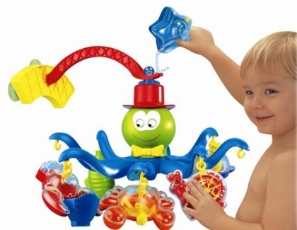 Игрушка для ванной Веселый осьминожка, диаметр 30см, высота 18см, в комплекте- 6 игрушек: Омар, Морской конёк, Улитка, Морская звезда-формочка, Кит-брызгалка и Краб.забавная и веселая игрушка для ванны.Осьминожка крепится присосками на стенку ванны, умеет покачиваться на воде. На его приподнятых кверху щупальцах есть крючки, куда можно повесить подвески – крабика с ковшом, кита, омара, улитку, морского конька, морскую звезду, ракушку. Все подвески наполовину выполнены из прозрачной пластмассы, наполовину – из обычной непрозрачной разных цветов. Каждая подвеска может выступать и как самостоятельная игрушка.Морскую звезду можно использовать как ковшик, лить из нее воду в шляпу осьминожки. Когда вода попадает в шляпу, глазки его удивленно двигаются.Веселый осьминожка упакован в картонную коробку.В комплекте:Осьминожка с кронштейном на присоске7 подвесокМатериал: пластмасса.