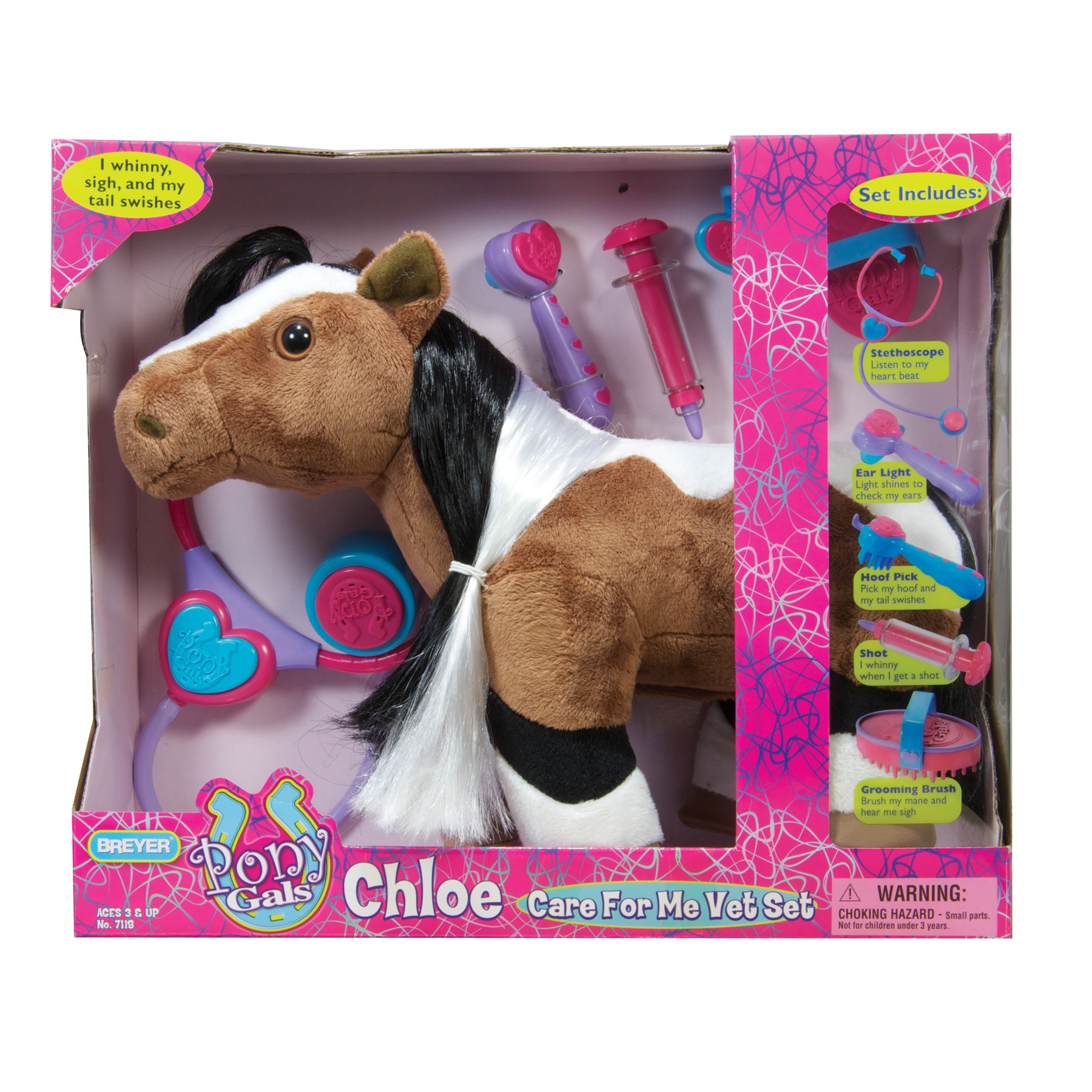 Плюшевая лошадка "Хлоя" с набором ветеринарных инструментов. Интерактивная лошадка Хлоя, имитирующая звуки реальных лошадей - может дернуть хвостом, слышно биение сердца, громкое ржание. В набор входят: плюшевая лошадь Хлоя 32 см, отоскоп для ушей, стетоскоп, шприц, щетка для хвоста и копыт. Все изготовлено из высококачественных материалов, экологично и абсолютно безопасно. Рекомендованный возраст от 3-х лет.