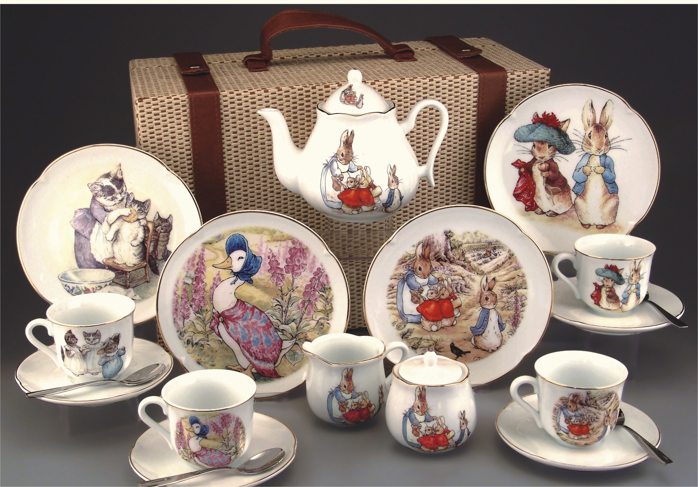 Детский чайный сервиз "Беатрис Поттер" в подарочном чемодане изготовлен из высококачественного фарфора немецкой компании REUTTER PORZELLAN. Был создан по эскизам рисунков всемирно известной писательницы Beatrix Potter.