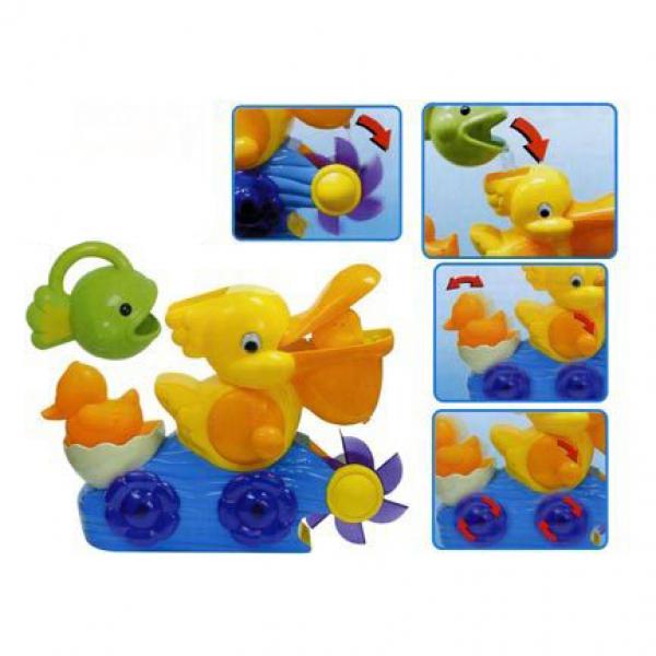 Когда малыш будет наполнять пеликана водой, он увидит, как смешно тот открывает и закрывает свой большой клюв ( там спрятался маленький утенок!). Вода из клюва пеликана переливается и попадает на водяное колесо, которое сразу же начинает вращаться под потоком воды.