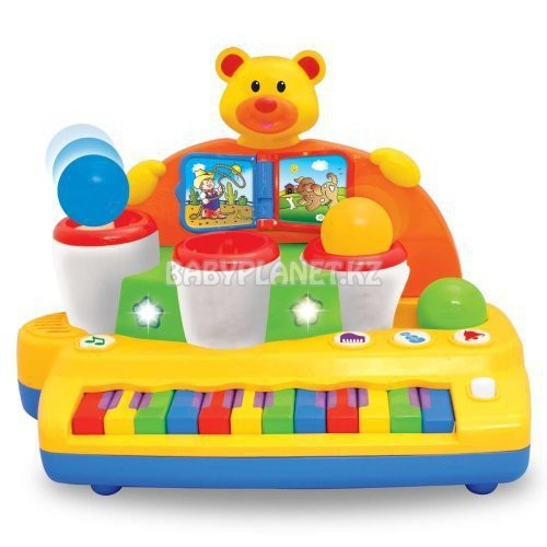 Развивающий центр "Активное пианино" 2 в 1 - это одновременно многофункциональный музыкальный инструмент, и игра в шарики. У пианино имеется 12 разноцветных клавиш, а также кнопочки, позволяющие играть гаммы и мелодии. Есть режимы разных инструментов, в том числе пианино, труба, скрипка. Центр играет разные мелодии, в это время загораются лампочки, а мишка танцует. Возле мишки имеется "книжка" с пластмассовыми страничками, на каждой из которых - картинка. При перелистывании страниц также играют разные мелодии. Между клавишами и книжкой расположены 3 стаканчика, куда нужно опускать шарик. Если шарик правильно опущен в стаканчик, он скатится вниз, а мы услишим определенный звук, для каждого стаканчика - свой.