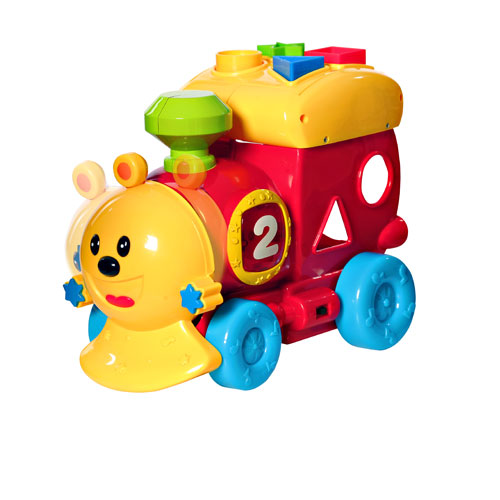 Кроме функции сортера (4 формочки (круг, треугольник, звезда, квадрат)), этот цветной паровозик умеет еще много интересного.